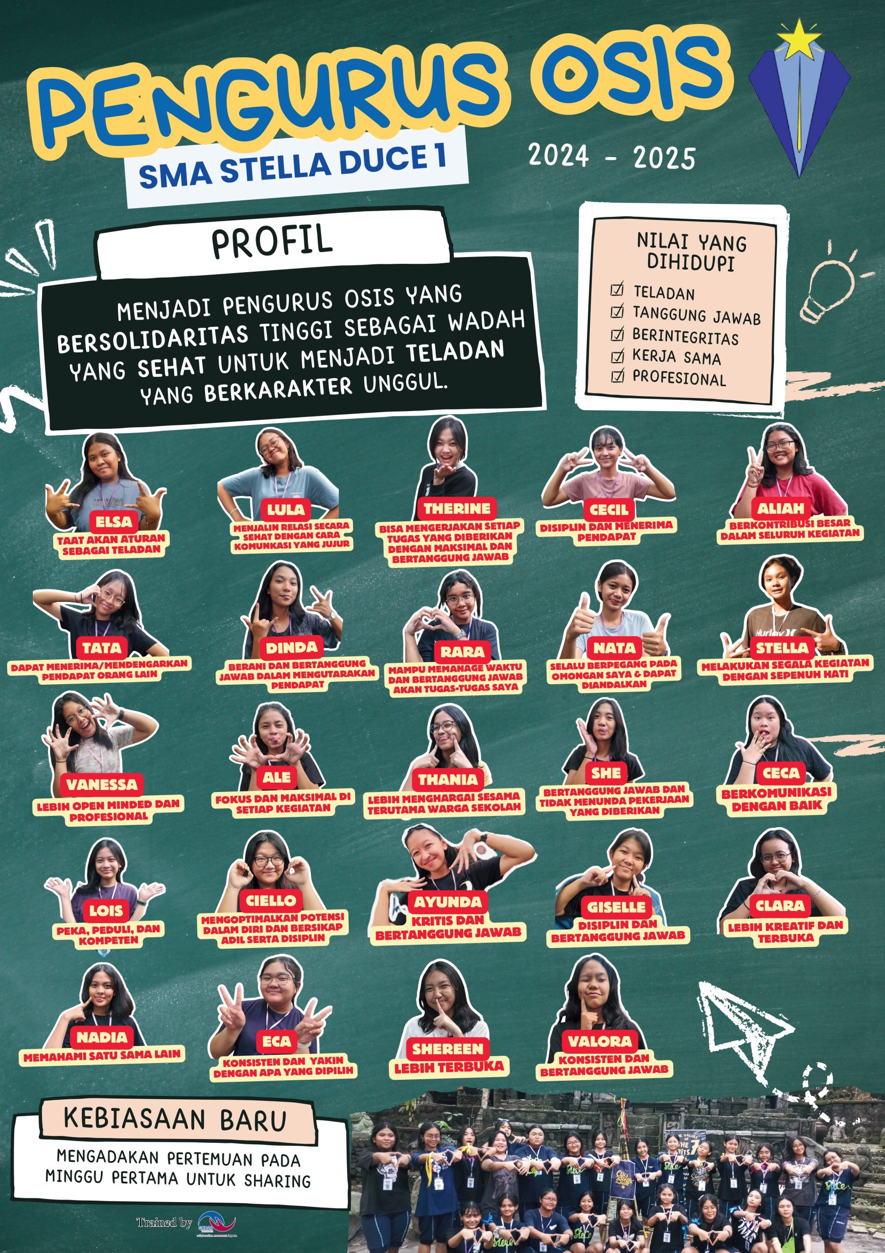 EVENT DESCRIPTION Pelatihan Kepemimpinan untuk pengurus OSIS SMA Stelle Duce periode 2024 – 2025 EVENT CONTENT Team Work Personal Branding Manajemen Organisasi Manajemen Diri Analisis SWOT